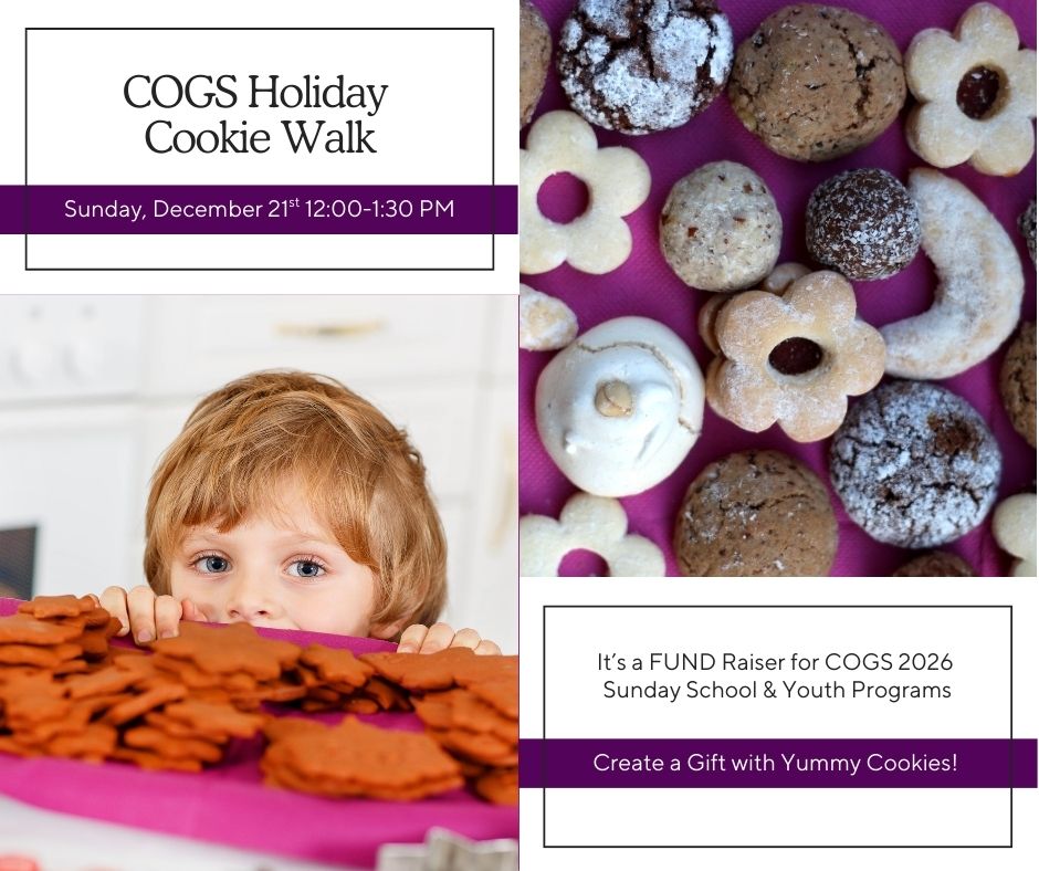 Winter Wonder Cookie Walk Fund Raiser following our worship service in the COGS hospitality room. Proceeds benefit COGS Sunday School & Youth Ministries.